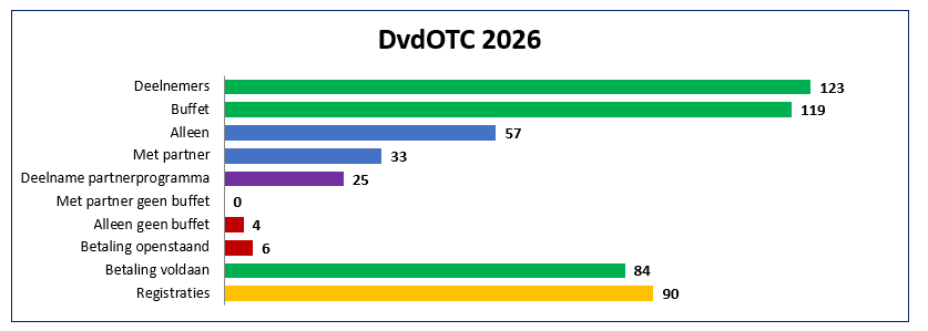 Uw registratie en betaling wordt NIET REALTIME weergegeven. De lijst wordt regelmatig bijgewerkt maar niet gelijk met uw registratie of betaling. Reden hiervoor is dat niet elke dag de bankgegevens worden opgehaald en er vaak nog een handmatige controle moet plaatsvinden. Indien u heeft betaald, wees dan gerust dat het is overgemaakt of controleer uw afschrijving. De OTC respecteert de privacy van alle gebruikers van haar site en draagt er zorg voor dat de persoonlijke informatie die u ons verschaft vertrouwelijk en zorgvuldig wordt behandeld. Dit is de reden dat de deelnemerslijst minimale informatie bevat. Informatie over partners en voedselallergie zijn weggelaten uit het overzicht.