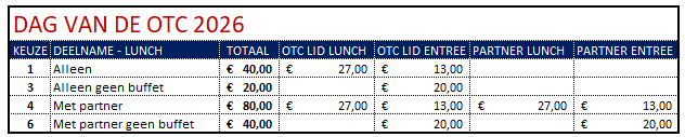 Druk op REGISTRATIE om u aan te melden. Na het versturen van uw registratie kan het dus een tijdje duren voordat uw informatie is bijgewerkt. Zijn er onverwacht problemen met het registreren, probeer het dan op een later tijdstip nog eens. PARTNERS DIE OTC LID ZIJN Door beide het registratieformulier in te vullen krijgt ieder OTC lid een badge waarop alle gegevens zijn geprint. (U hoeft dan niet de partnergegevens in te vullen). Calls met een Ø (Alt + 157 en Alt + 155 en ook Alt + 0216 en Alt + 0248) worden niet geaccepteerd. CONTROLEER UW EMAIL